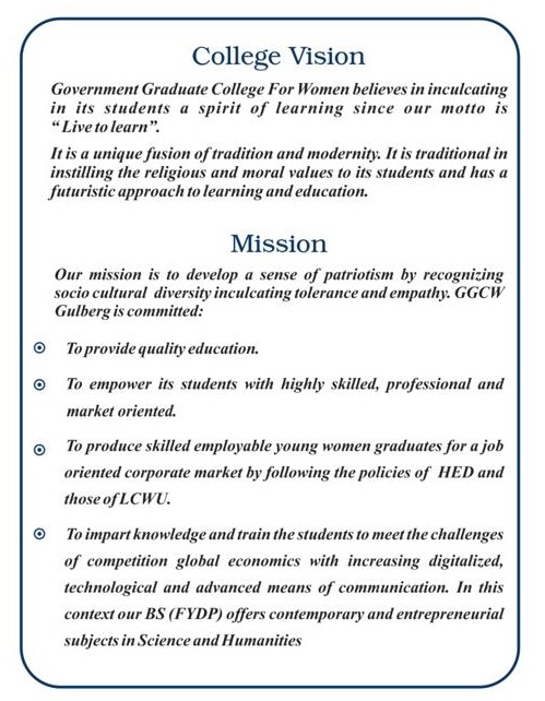 Rooted in our vision, “Live to Learn,” we believe that education is not a destination but a lifelong journey. At GGCW Gulberg, we are committed to providing a dynamic and inclusive learning environment where curiosity is nurtured, critical thinking is encouraged, and potential is transformed into purpose.
